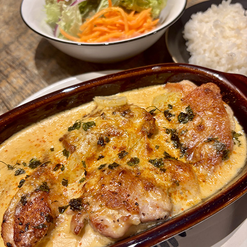 レモンとペッパーでマリネした鶏もも肉をこんがり焼いて、ピリ辛のガーリッククリームソースをたっぷりかけてグリルした欧州ジョージアの郷土料理。リピーターの多い当店人気メニューです。